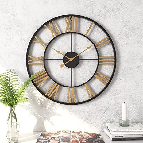 ?OVERSIZE WALL CLOCK: 24 inch black Roman numerals clock with the golden hands are easy to read;Simply hang to wall using the one round keyhole style installation located on the center back.